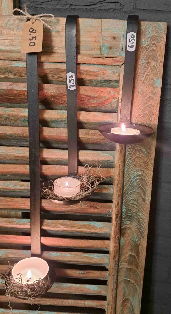 Mooie oude stoere roestbruine, industriële theelichthouders/ lepels om ergens aan op te hangen, bijvoorbeeld aan een Louvre luik, vaas of Nepalese kruik.